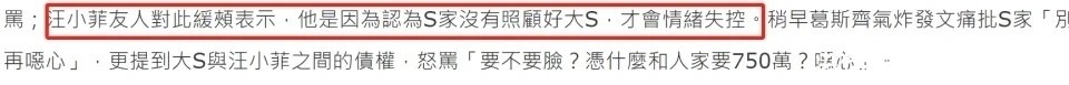 最近一次开火,就是通过台媒说汪小菲在大S火化之前打电话痛骂S妈跟小S,质问他们怎么照顾的大S。结果此举也惹怒了相关方,汪小菲先是通过友人回应,表示自己当时骂人有原因,他们没照顾好大S让她送命,自己太崩溃情绪失控。